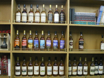 ショールームの棚には、たくさんのシングルモルトウイスキーが並んでました。