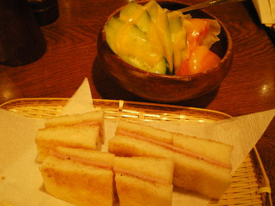 粒マスタードが入ったサンドイッチとっても美味しかったです。手作りの荒っぽさに細心のマスターの愛情が入っています。サラダのドレッシングといい、パンの厚みや、レタスと卵焼きのミックス感といい、ジュシーさと香辛料の小気味よさとが、絶妙なバランスで主張している最高のサンドウィッチでした。