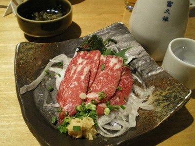 スライスオニオンにのっかった馬刺しです。