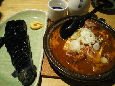 決め手は、茄子の一本漬けと、牛ホルモンの土手鍋風です。