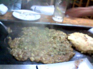 3人でお好み焼き3枚、もんじゃ1枚、ツブ貝バター焼き、はんぺん焼きをぺろり。