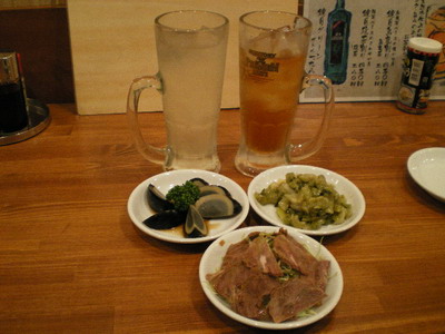 前菜にピータン280円、高菜とイカの炒め280円、牛すじの煮込み280円でかんぱ~い
