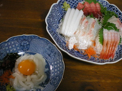 烏賊のお刺身の美味しい食べ方、生卵の黄身を入れてマゼマゼして食べて美味しいよ♪