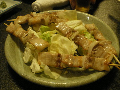 何本でも食べれそうです。この串焼きの下にあるキャベツには出汁酢がかかって