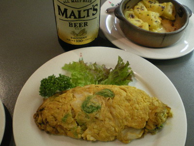 手前のキムチオムレツは、これがまた、いい味出して飽きのこないオムレツに仕上がって
