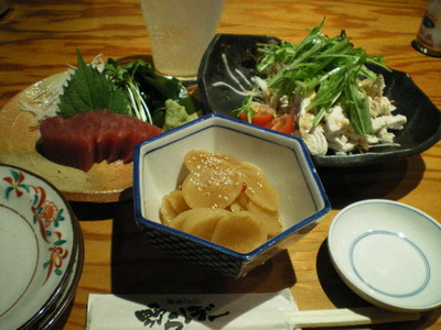 讃岐は母の味たくあんのきんぴら350円、まぐろ刺身580円、鶏胸肉バンバンジーサラダ550円
