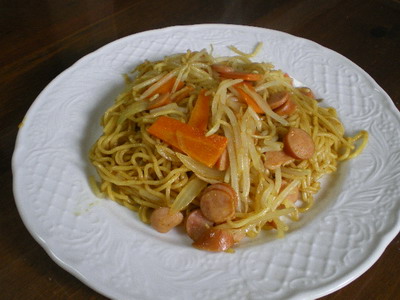 お腹出してるぅお昼は簡単に焼きそばを・・・カレー粉を入れてカレー味に